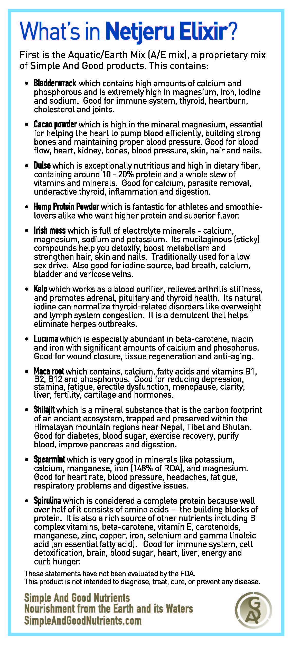 This mix contains a proprietary blend of Bladderwrack, Bacopa, Cacao, Dulse, Hemp, Irish Moss, Kelp, Lucuma, Maca Root, Milk Thistle, Mint, Shilajit and Spirulina.